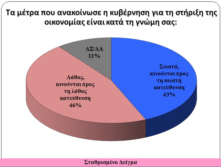 Στο παρακάτω γράφημα αποτυπώνεται η άποψη των πολιτών για τα μέτρα που έλαβε η κυβέρνηση για τη στήριξη της Οικονομίας. Οι θετικές απόψεις για την κυβέρνηση μειοψηφούν. Το 43% των πολιτών μόνον θεωρεί πως τα μέτρα αυτά κινούνται στη σωστή κατεύθυνση. Αντιθέτως το 46% των πολιτών εκτιμά πως τα μέτρα κινούνται προς τη λάθος κατεύθυνση. Το 11% απαντά «Δεν ξέρω/Δεν Απαντώ». Είναι προφανές πως στον στίβο της πραγματικής πολιτικής (και Οικονομίας) και πέρα από τα επικοινωνιακά τεχνάσματα η κοινωνία καταλήγει σε διαφορετικά συμπεράσματα από εκείνα που επιδιώκουν οι κυβερνητικοί επικοινωνιολόγοι.