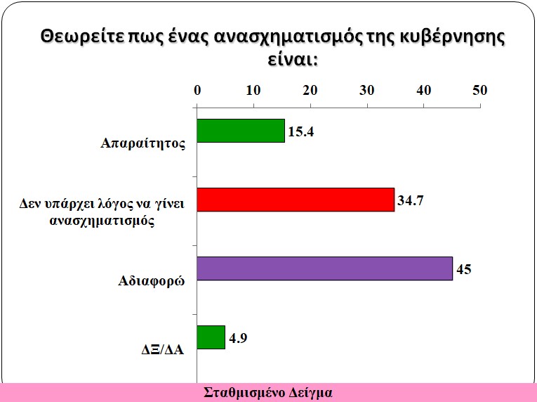 Η συντριπτική πλειοψηφία των πολιτών αδιαφορεί ή δεν θεωρεί απαραίτητο να ασχολείται με την υπόθεση «Ανασχηματισμός». Αντιλαμβανόμενοι οι πολίτες πως ο κάθε κυβερνητικός ανασχηματισμός είναι πρωτίστως ένα επικοινωνιακό παιχνίδι όλων των κυβερνήσεων παίρνουν τις αποστάσεις τους. Έτσι το καταλυτικό 45% αδιαφορεί πλήρως για το εάν θα πρέπει ή όχι να γίνει ανασχηματισμός, ενώ το χαρακτηριστικό 34,7% δηλώνει πως δεν υπάρχει λόγος να γίνει ανασχηματισμός. Μόνον ένα «σκληροπυρηνικό» και προφανώς κομματικής προέλευσης 15,4% κρίνει πως ο ανασχηματισμός είναι απαραίτητος.