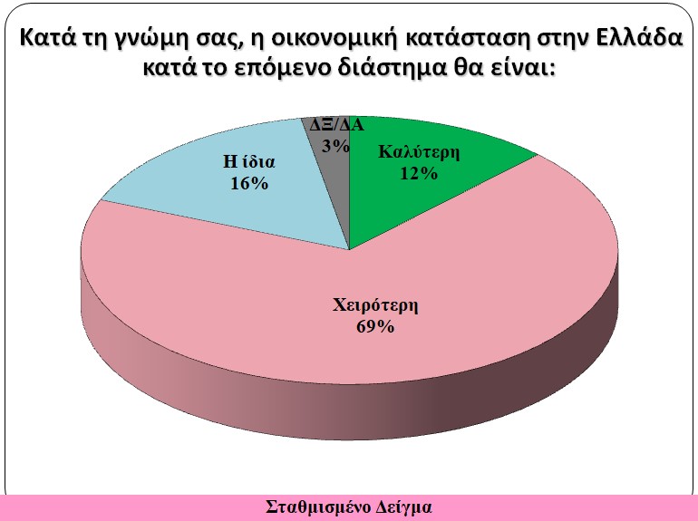 Στο παρακάτω γράφημα αποτυπώνεται ο βαθμός απαισιοδοξίας των πολιτών ως προς τις οικονομικές προοπτικές. Το κλίμα είναι βαρύ και οι υφεσιακές προοπτικές για την παγκόσμια οικονομία επηρεάζουν και την ελληνική κοινωνία. Ήδη, όπως είδαμε και προηγουμένως, οι Έλληνες ανησυχούν πρωτίστως για την πορεία της Οικονομίας. Στο γράφημα που ακολουθεί η ανησυχία αυτή εκφράζεται και ως απαισιοδοξία για το μέλλον, αφού το 69% των συμμετεχόντων στη δημοσκόπηση δήλωσαν πως η κατάσταση της Οικονομίας θα είναι χειρότερη κατά την επόμενη περίοδο. Το 16% θεωρεί πως τα πράγματα θα είναι τα ίδια, ενώ μόνον ένα 12% εκτιμά πως η οικονομική κατάσταση θα είναι καλύτερη στο μέλλον.
