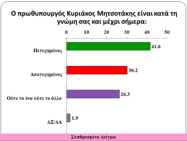 Στο ερώτημα κατά πόσο ο Κυριάκος Μητσοτάκης με την έως σήμερα θητεία του είναι πετυχημένος ή αποτυχημένος, το 41,6% των ερωτηθέντων απαντά θετικά και θεωρεί πετυχημένη την πορεία του πρωθυπουργού. Το 30,2% θεωρεί τον Κυριάκο Μητσοτάκη αποτυχημένο, ενώ ένα αξιοσημείωτο 26,3% θεωρεί πως ο κ. Μητσοτάκης δεν είναι ούτε πετυχημένος ούτε και αποτυχημένος. Θεωρεί δηλαδή πως η μέχρι σήμερα θητεία του ανήκει στη φάση του πολιτικού λυκόφωτος.