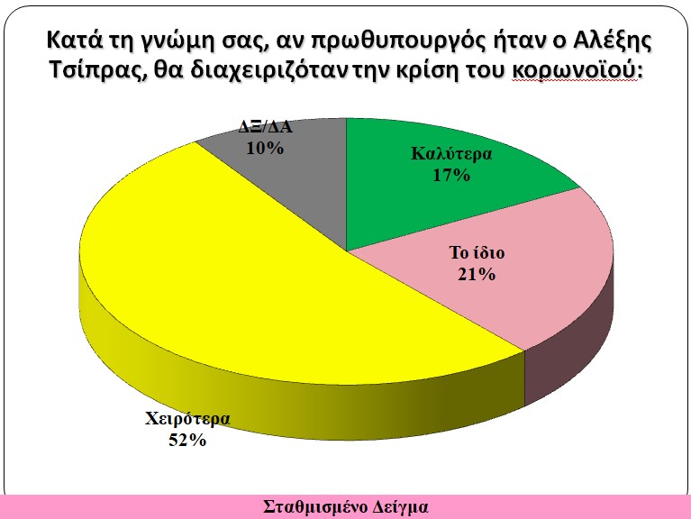 Τα πράγματα δεν είναι ιδιαιτέρως θετικά και μάλλον εξελίχθηκαν αρνητικά για τον πρώην πρωθυπουργό Αλέξη Τσίπρα, αφού το 52% των πολιτών κρίνουν πως αν ήταν ακόμη πρωθυπουργός θα διαχειριζόταν χειρότερα την κρίση του κορωνοϊού. Μόλις το 17% των ερωτηθέντων εκτιμά πως θα ήταν καλύτερος διαχειριστής της κρίσης. Το 21% κρίνει πως το αποτέλεσμα θα ήταν το ίδιο και το αυτό. Διαπιστώνεται δηλαδή ένα έλλειμμα αξιοπιστίας ως προς τη διαχείριση με αποτελεσματικότητα και σοβαρότητα μεγάλων και σημαντικών κρίσεων. Πρόκειται για ένα πολιτικό ντεζαβαντάζ το οποίο θα πρέπει να λάβει σοβαρά υπόψη του ο αρχηγός της αξιωματικής αντιπολίτευσης.