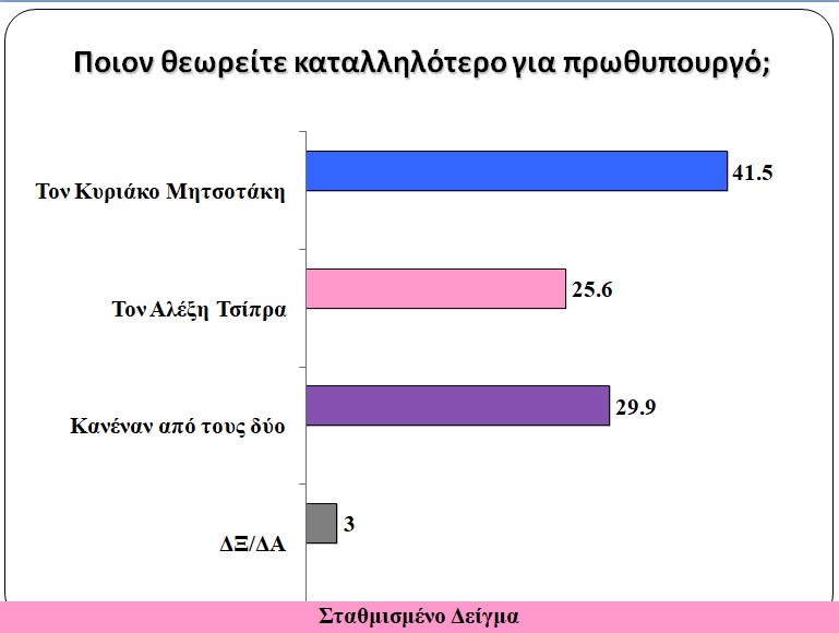 Κατόπιν όλων των προηγουμένων καταλήγουμε στο πάγιο ερώτημα περί καταλληλότητας πρωθυπουργού, όπου ο Κυριάκος Μητσοτάκης προηγείται με καθαρή διαφορά από τον Αλέξη Τσίπρα. Ο σημερινός πρωθυπουργός προηγείται με ένα 41,5% του αρχηγού της αξιωματικής αντιπολίτευσης, ο οποίος συγκεντρώνει ένα 25,6%. Το ποσοστό των πολιτών που θεωρεί πως κανένας από τους δύο δεν είναι ο καταλληλότερος περιορίζεται στο 29,9% .