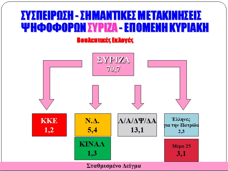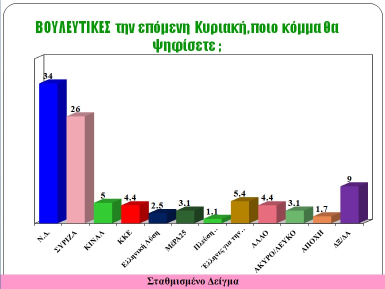 Έτσι και στη βάση ενός πολύ καλού δείγματος που αγγίζει τους 4.500 συμμετέχοντες στη δημοσκόπηση της Ζούγκλας, αν οι εκλογές διεξάγονταν την επόμενη Κυριακή, η Νέα Δημοκρατία θα ερχόταν πρώτη με 34% και ο ΣΥΡΙΖΑ δεύτερος με 26%, με τη μεταξύ τους διαφορά να ανέρχεται στις 8 ποσοστιαίες μονάδες. Τρίτο κόμμα το ΚΙΝΑΛ με ένα 5%, που σημαίνει πως διατηρεί απλώς το μίνιμουμ των δυνάμεών του χωρίς να καταφέρνει να συγκεντρώσει έστω και ένα μικρό ποσοστό δυσαρεστημένων από τα δύο μεγάλα κόμματα. Παρατηρείται πως το ΚΙΝΑΛ έναν χρόνο μετά τις εκλογές δεν βρίσκει βηματισμό και εξαντλείται από την ασφυκτική πίεση που του ασκείται από τα δεξιά και από τα αριστερά του.