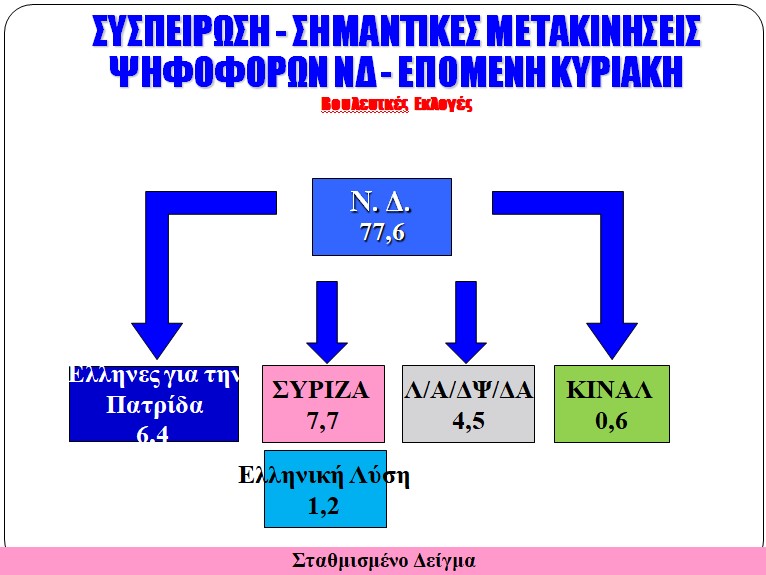 Υψηλό ποσοστό συσπείρωσης επιτυγχάνει η Νέα Δημοκρατία, που συγκεντρώνει ένα 77,6%. Το κυβερνητικό κόμμα παρουσιάζει διαρροές προς τα ακροδεξιά και το κόμμα του Ηλία Κασιδιάρη της τάξης του 6,4% και προς τον ΣΥΡΙΖΑ (7,7%). Μία πολύ μικρή διαρροή παρατηρείται από τη ΝΔ προς το κόμμα του Κυριάκου Βελόπουλου, που δεν ξεπερνά το 1,2% και το οποίο δεν προσδίδει τίποτε στην Ελληνική Λύση, που τροφοδοτεί με το 25% των ψηφοφόρων της το κόμμα του Ηλία Κασιδιάρη (δείτε το παρακάτω γράφημα).