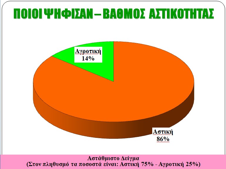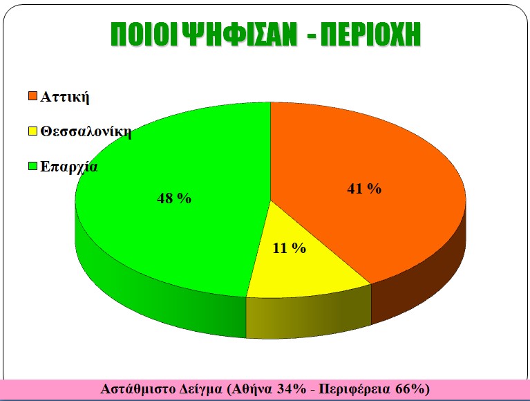 Όπως δείχνει και το παρακάτω γράφημα, το 48% των ψηφισάντων ζουν στην Αθήνα, το 11% στη Θεσσαλονίκη και το υπόλοιπο 41% ζει στην ελληνική περιφέρεια.