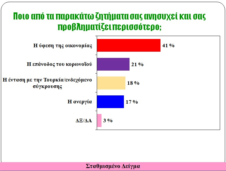 Το πρώτο ερώτημα επιχειρεί να εντοπίσει τον βαθμό ανησυχίας των πολιτών σε μία σειρά από σοβαρά ζητήματα που αντιμετωπίζει η χώρα όπως η Οικονομία, η Υγειονομική Κρίση, αλλά και οι ελληνοτουρκικές σχέσεις και το ενδεχόμενο μίας κλιμάκωσης της έντασης. Η διαβάθμιση των ανησυχιών των πολιτών, όπως δείχνει και το γράφημα, έχει ως εξής: