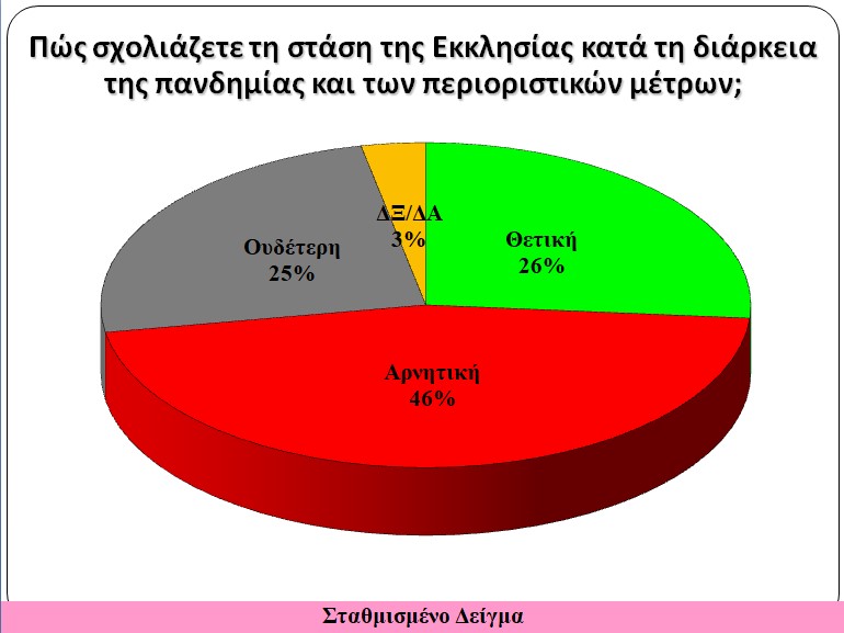 Το επόμενο ερώτημα αφορά τη στάση που τήρησε η Εκκλησία κατά τη διάρκεια της πανδημίας και ενώ η Πολιτεία επιχειρούσε να αντιμετωπίσει την επέλαση του κορωνοϊού. Όπως καταδεικνύεται και στο παρακάτω διάγραμμα, το 46% των πολιτών κρίνουν πως η στάση της Εκκλησίας ήταν αρνητική και μόλις το 26% εκτιμά πως η στάση της ήταν θετική. Ένα 25% εκτιμά πως η στάση των Εκκλησιαστικών Αρχών και του Κλήρου γενικά ήταν ουδέτερη.