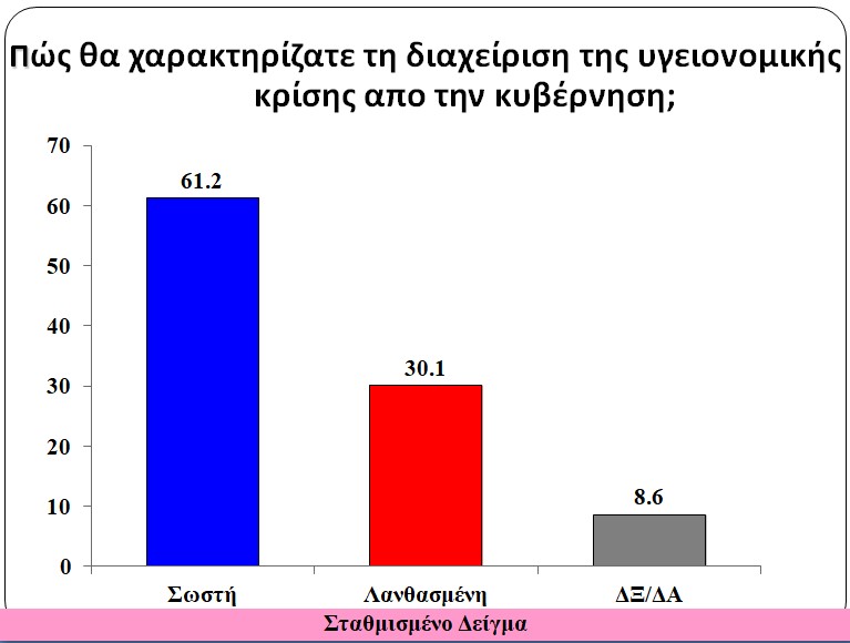 Στην επόμενη ερώτηση οι πολίτες κλήθηκαν να τοποθετηθούν έναντι της απόδοσης της κυβέρνησης στην αντιμετώπιση της υγειονομικής κρίσης. Έτσι στο ερώτημα «Πώς θα χαρακτηρίζατε τη διαχείριση της υγειονομικής κρίσης από την κυβέρνηση» με μεγάλη πλειοψηφία, που φθάνει το 61,2%, οι πολίτες χαρακτηρίζουν το έργο της κυβέρνησης θετικό, ενώ το 30,1% αρνητικό. Μεγάλο είναι το ποσοστό που αγγίζει το 8% των πολιτών που δεν παίρνουν θέση και προτιμούν να δηλώσουν «Δεν ξέρω/Δεν απαντώ», παρ΄ ότι το ζήτημα της πανδημίας είναι εξαιρετικά κρίσιμο και αφορούσε το σύνολο του πληθυσμού στην καθημερινότητά του. Αυτό το 8% χρειάζεται μία πιο επισταμένη προσέγγιση για να εξηγηθεί.
