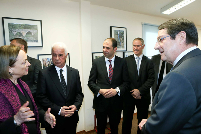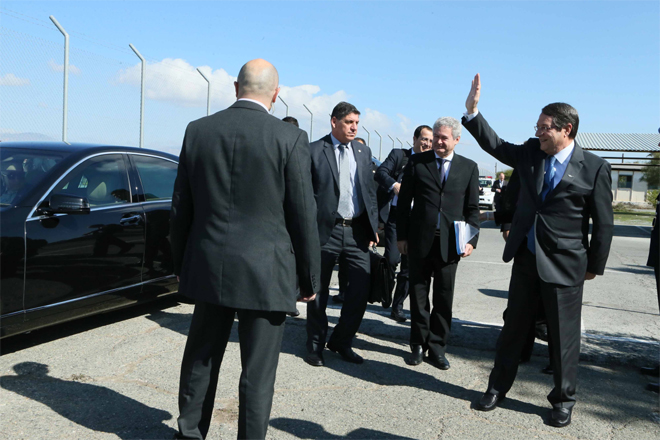 Δύο λεπτά αργότερα έφθασε στο χώρο ο Πρόεδρος Αναστασιάδης, τον οποίο επίσης υποδέχθηκε η κ. Μπάτενχαϊμ. Τον συνοδεύουν ο διαπραγματευτής της ελληνοκυπριακής πλευράς Ανδρέας Μαυρογιάννης, ο Διευθυντής του Διπλωματικού του Γραφείου Νίκος Χριστοδουλίδης και τα υπόλοιπα μέλη της αντιπροσωπείας της ε/κ πλευράς.