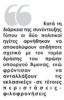 Κατά τη διάρκεια της συνέντευξης Τύπου οι δύο πολιτικοί ηγέτες αρνήθηκαν να αποκαλύψουν οτιδήποτε σχετικό με τον τομέα δράσης του πρώην υπουργού Άμυνας, ενώ φρόντισαν να ανταλλάξουν τις «κλασικές» -σε τέτοιες περιστάσεις- φιλοφρονήσεις. Σε αντίθεση με προηγούμενες περιπτώσεις, όταν ο πρωθυπουργός της Ελλάδας υποδεχόταν ξένους ηγέτες στην Αθήνα, αυτήν τη φορά οι κοινές δηλώσεις προς τον Τύπο εμπεριείχαν στοιχεία της «πλούσιας» επικαιρότητας. Η Αργεντινή και η πρόσφατη είσοδό της σε καθεστώς «επιλεκτικής χρεοκοπίας» χρησιμοποιήθηκε εκατέρωθεν για την προβολή των μεταρρυθμίσεων που έγιναν τα τελευταία χρόνια στην Ελλάδα και κυρίως για το τι θα μπορούσε -ενδεχομένως- να συμβεί στην περίπτωση που η Αθήνα χόρευε σε ρυθμούς τάνγκο, όταν βρισκόταν με το 1,5 πόδι εκτός Ευρωζώνης.