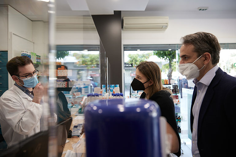 Ο Κυριάκος Μητσοτάκης εξήγησε ότι η Δάφνη βρίσκεται στη Γ’ Λυκείου, έτσι προσήλθαν στο φαρμακείο για την προμήθεια του self-test. «Ήρθαμε να πάρουμε το τεστ μας. Πώς πάνε μέχρι στιγμής οι παραδόσεις;», ρώτησε ο πρωθυπουργός τον φαρμακοποιό για να του απαντήσει πως «οι παραδόσεις επί του παρόντος σε εμάς είναι ομαλές. Η πλατφόρμα δουλεύει μία χαρά, είμαστε πάντα στο πλευρό του καθενός όποτε θέλει για διευκρινίσεις. Του τα εξηγούμε λεπτομερώς, για να έχει μία πρώτη άποψη. Από εκεί και πέρα του δίνουμε και τις οδηγίες και πάντα εδώ είμαστε, τα τηλέφωνά μας τα ξέρουν».