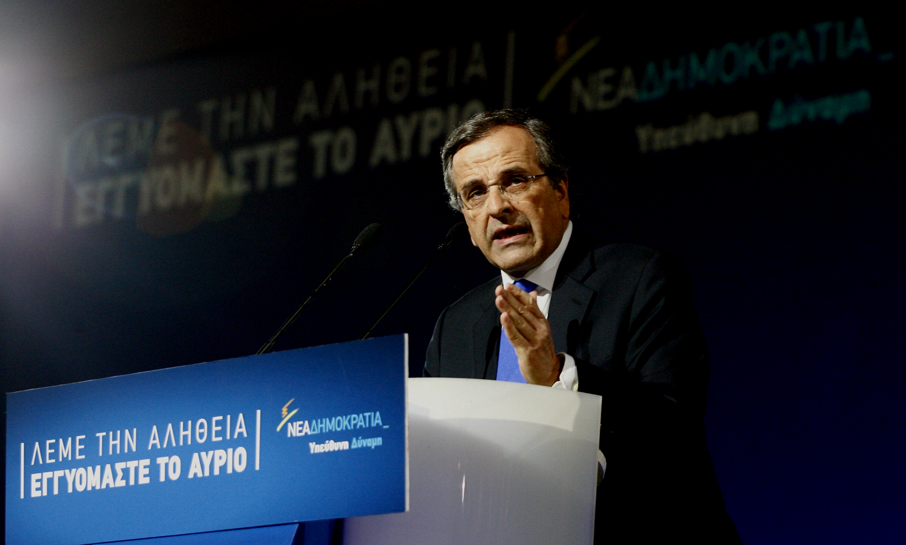 «Τη Δευτέρα θα είναι κυβέρνηση η Νέα Δημοκρατία. Ό,τι έκανα αυτά τα 2,5 χρόνια, το έκανα για να έχει ελπίδα η ελληνική νεολαία», ανέφερε ο Αντώνης Σαμαράς από το βήμα της κεντρικής προεκλογικής συγκέντρωσης της Νέας Δημοκρατίας, στο κλειστό γυμναστήριο του Τάε Κβο Ντο, στο Φάληρο.