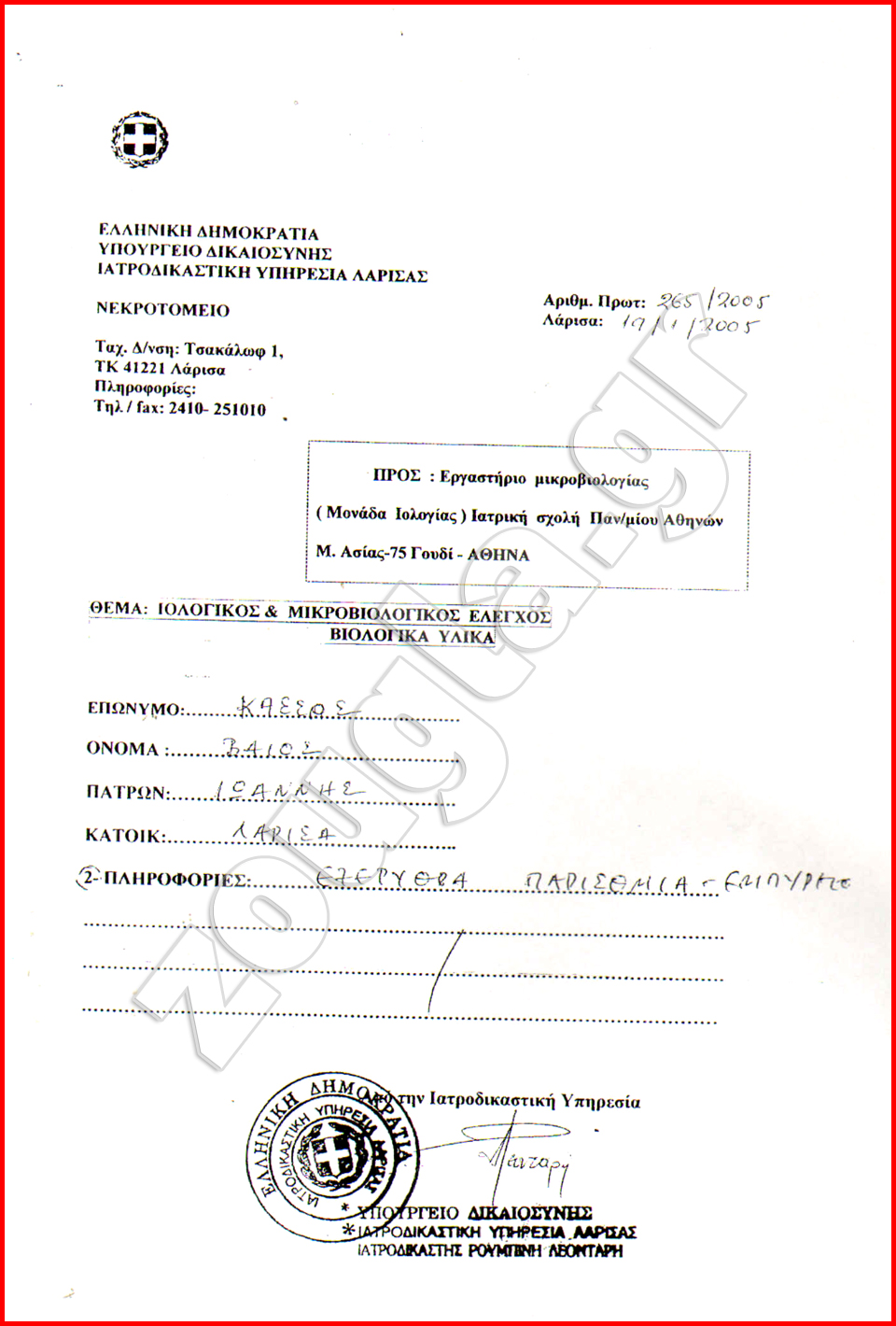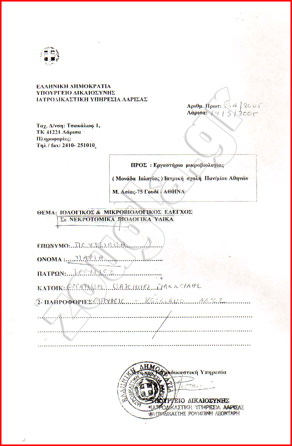 Ενδεικτικά του «μπαχάλου» που επικρατούσε και επικρατεί στην Ιατροδικαστική Υπηρεσία Λάρισας είναι δυο έγγραφα που βρίσκονται στη διάθεση της zougla.gr και φέρουν την υπογραφή της υποψήφιας βουλευτή της ΔΗ.ΣΥ. Βάσει των συγκεκριμένων εγγράφων, δυο νεκροτόμοι ( οι κ.κ. Μαρία Πιουτσιάκα και Βάϊος Κάσσος) περιέρχονται σε λίστα νεκρών η οποία απεστάλη στο Εργαστήριο Μικροβιολογίας του Πανεπιστημίου Αθηνών στο πλαίσιο του ελέγχου ελέγχου των αιμάτων νεκρών στη διεξαγόμενη επιδημιολογική έρευνα για τους εντεροϊούς, και δή για το Κοξάκι Β3! Τελικά, η κυρία Λεονταρή δε διώχθηκε ποτέ για το ανωτέρω θέμα, αφού με διάταξη του Εισαγγελέα Πρωτοδικών Λάρισας, κ. Μπατουδάκη, κρίθηκε ότι δεν μπορούσε να έχει δόλο…