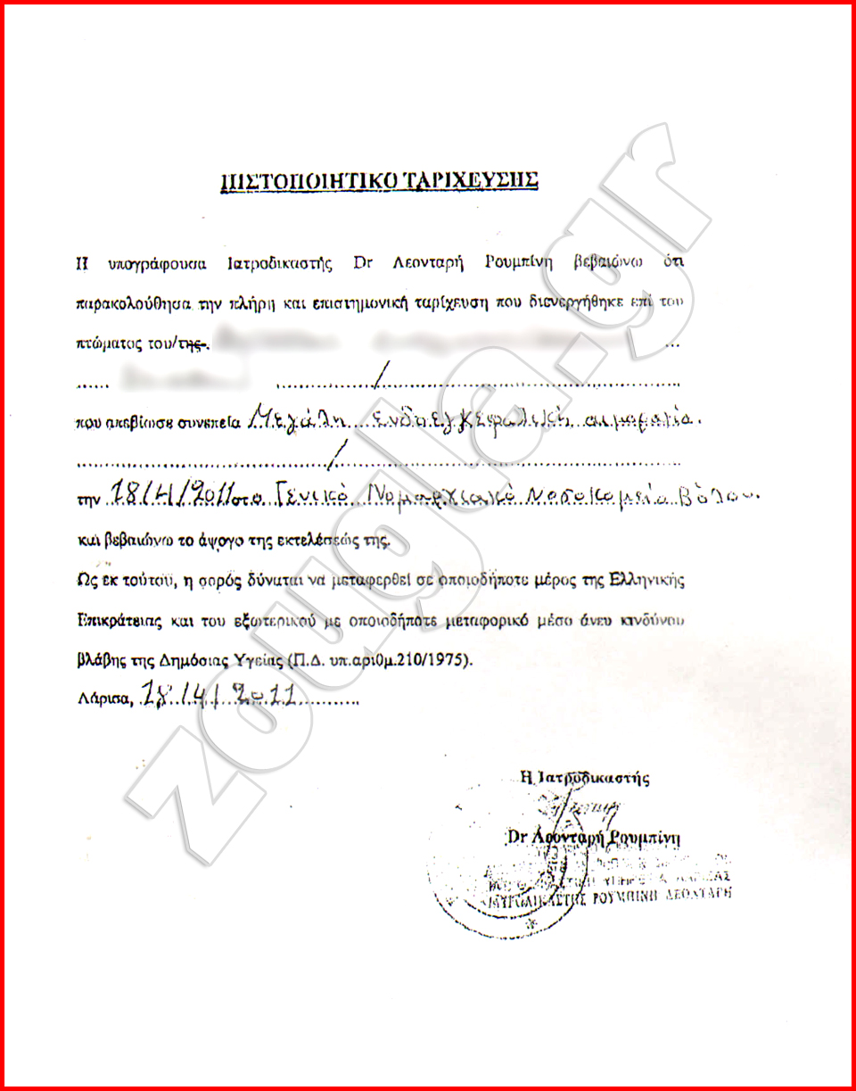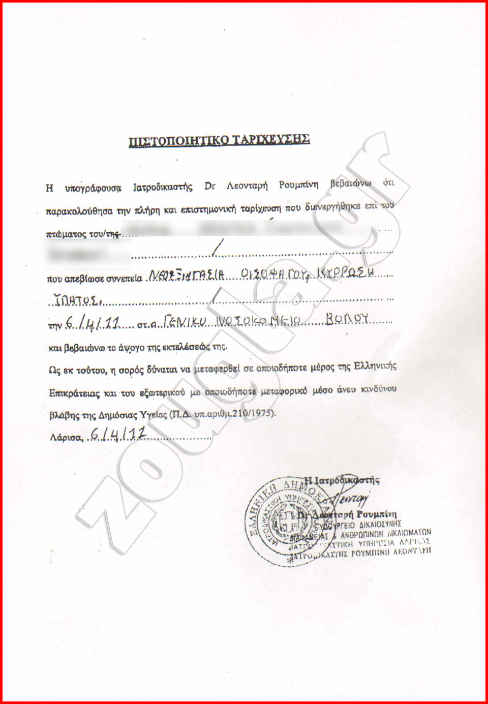 Εντυπωσιακότερο όλων όμως είναι τα στοιχεία τα οποία προέκυψαν από την κατάθεση του μάρτυρα σχετικά με τις ταριχεύσεις που υπογράφει η πολιτευτής της ΔΗ.ΣΥ. στις 6 και 18 Απριλίου του 2011. Και οι δυο εμφανίζονται να έχουν πραγματοποιηθεί στο Γενικό Νοσοκομείο Βόλου και είναι επικυρωμένες από την κυρία Λεονταρή.