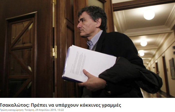 Ανοιχτό το ενδεχόμενο δημοψηφίσματος σε περίπτωση που κινδυνεύσουν οι κόκκινες γραμμές της κυβέρνησης αφήνει ο υπουργός Διεθνών Οικονομικών Σχέσεων Ευκλείδης ΤσακαλώτοςΌπως δήλωσε χαρακτηριστικά, αναφορικά με το ενδεχόμενο δημοψηφίσματος ή εκλογών, «οι κόκκινες γραμμές πρέπει να υπάρχουν με ό,τι αυτό συνεπάγεται, αν κινδυνεύουν να διαταραχθούν, τον λόγο θα πρέπει να έχει ο λαός, για να παρέμβει και να τις διασφαλίσει».