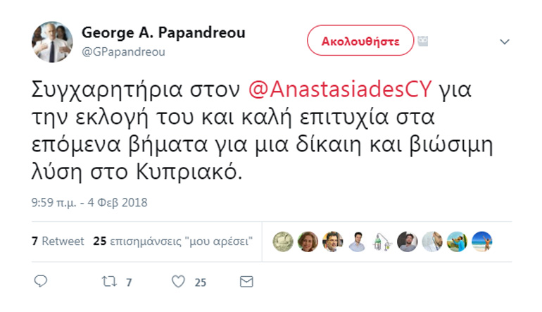 Ο πρόεδρος του Κινήματος Δημοκρατών Σοσιαλιστών και της Σοσιαλιστικής Διεθνούς, Γιώργος Α. Παπανδρέου, εξέφρασε με τη σειρά του τα συγχαρητήρια προς τον Νίκο Αναστασιάδη, ο οποίος επανεξελέγη πρόεδρος της Κύπρου.