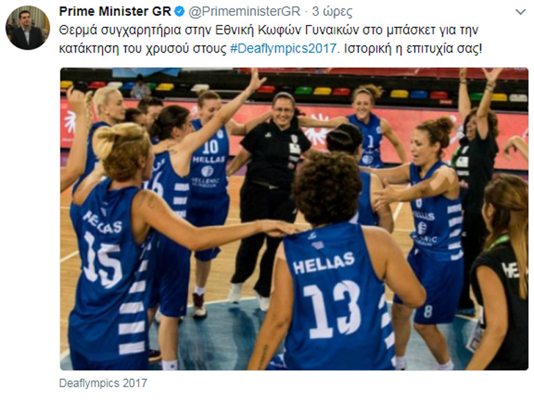 Σε ανάρτησή του στο Twitter, ο κ. Τσίπρας χαρακτηρίζει ιστορική την επιτυχία, σημειώνοντας χαρακτηριστικά: «Θερμά συγχαρητήρια στην Εθνική Κωφών Γυναικών στο μπάσκετ για την κατάκτηση του χρυσού στους #Deaflympics2017. Ιστορική η επιτυχία σας!».