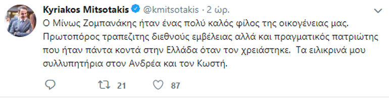 «Ο Μίνως Ζομπανάκης ήταν ένας πολύ καλός φίλος της οικογένειας μας. Πρωτοπόρος τραπεζίτης διεθνούς εμβέλειας αλλά και πραγματικός πατριώτης που ήταν πάντα κοντά στην Ελλάδα όταν τον χρειάστηκε. Τα ειλικρινά μου συλλυπητήρια στον Ανδρέα και τον Κωστή» έγραψε ο πρόεδρος της ΝΔ Κυριάκος Μητσοτάκης σε ανάρτησή του στο twitter.