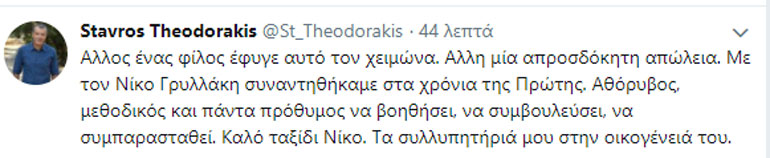 Με ένα σχόλιο στον προσωπικό λογαριασμό του στο twitter, ο Σταύρος Θεοδωράκης εκφράζει τα συλλυπητήριά για τον ξαφνικό θάνατο του δημοσιογράφου Νίκο Γρυλλάκη,