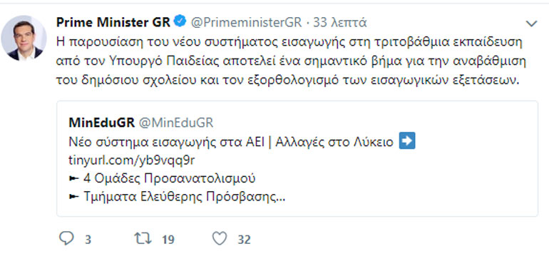 «Η παρουσίαση του νέου συστήματος εισαγωγής στη τριτοβάθμια εκπαίδευση από τον Υπουργό Παιδείας αποτελεί ένα σημαντικό βήμα για την αναβάθμιση του δημόσιου σχολείου και τον εξορθολογισμό των εισαγωγικών εξετάσεων» σημειώνει ο πρωθυπουργός.