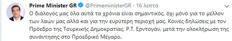 Λίγα λεπτά μετά την έναρξη της κοινής συνέντευξης Τύπου Ερντογάν-Τσίπρα, στον επίσημο λογαριασμό του Έλληνα πρωθυπουργού στο Twitter έγινε η εξής ανάρτηση:
