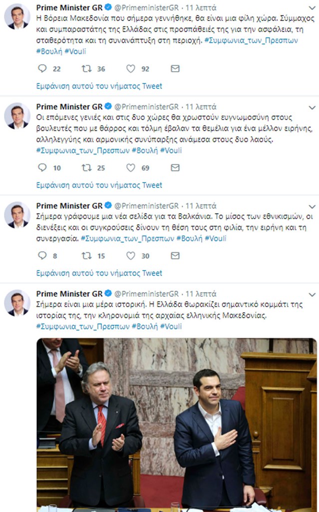 «Σήμερα είναι μια μέρα ιστορική. Η Ελλάδα θωρακίζει σημαντικό κομμάτι της ιστορίας της, την κληρονομιά της αρχαίας ελληνικής Μακεδονίας», τονίζει ο πρωθυπουργός Αλέξης Τσίπρας αμέσως μετά την επικύρωση της Συμφωνίας των Πρεσπών από τη Βουλή των Ελλήνων, σε δήλωσή του στην προσωπική σελίδα του στο Facebooκ και το Twitter.