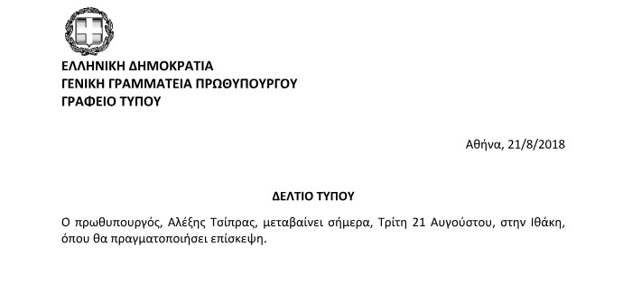 Η επίσημη ανακοίνωση για την επίσκεψη του πρωθυπουργού στην Ιθάκη: