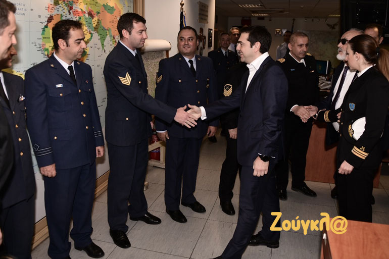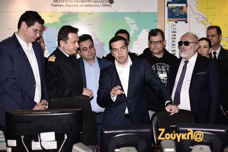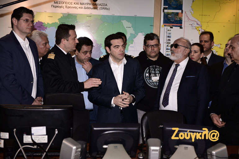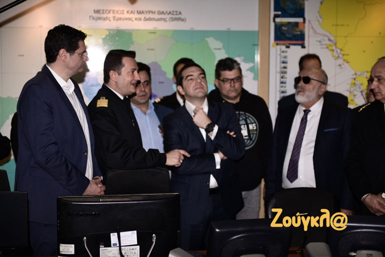 Κατά την άφιξή του, τον κ. Τσίπρα υποδέχθηκε η πολιτική ηγεσία του Υπουργείου Ναυτιλίας και στη συνέχεια μετέβησαν στο Εθνικό Συντονιστικό Κέντρο Επιτήρησης και Ελέγχου Συνόρων, το οποίο περιλαμβάνει το Ενιαίο Κέντρο Συντονισμού Έρευνας και Διάσωσης, καθώς και το Κέντρο Επιχειρήσεων του Λιμενικού. Ο πρωθυπουργός ενημερώθηκε για τις δυνατότητες και τον ρόλο του Κέντρου.