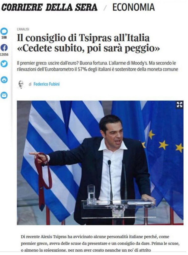 «Είναι αυτό που εννοεί ο Τσίπρας όταν καλεί τους Ιταλούς να αλλάξουν πορεία για να αποφύγουμε να το πράξουμε από ανάγκη όταν θα έχουν επέλθει βαρύτατες ζημίες στην ιταλική οικονομία», αναφέρει η Corriere della Sera, θυμίζοντας το κόστος στην ελληνική οικονομία από τις αποφάσεις του Αλέξη Τσίπρα.