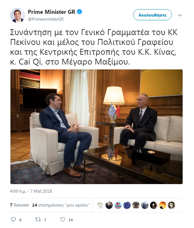 Με τον γγ του ΚΚ Πεκίνου και μέλος του Πολιτικού Γραφείου και της Κεντρικής Επιτροπής του ΚΚ Κίνας, Cai Qi, συναντάται ο πρωθυπουργός Αλέξης Τσίπρας στο Μέγαρο Μαξίμου, ο οποίος ανήρτησε και στιγμιότυπο από τη συνάντηση στον προσωπικό του λογαριασμό, στο twiiter.