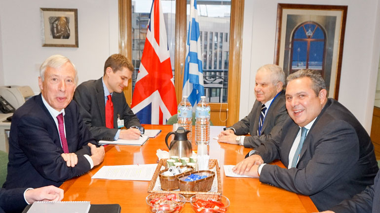 Ο Υπουργός Εθνικής Άμυνας Πάνος Καμμένος, στο πλαίσιο της συμμετοχής του στη Σύνοδο Εξωτερικών και Άμυνας της Ευρωπαϊκής Ένωσης, που πραγματοποιείται στις Βρυξέλλες, συναντήθηκε με τον Αναπληρωτή Υπουργό Άμυνας του Ηνωμένου Βασιλείου Λόρδο Earl Howe.