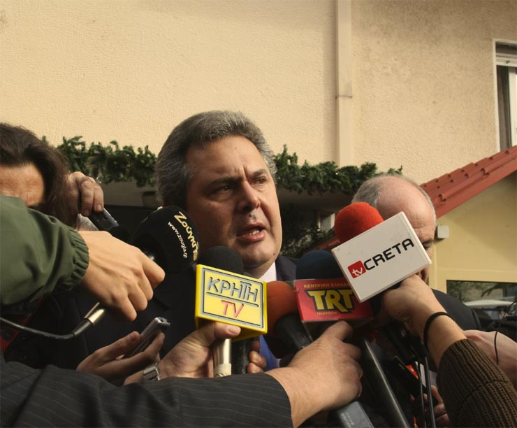 «Οι εκλογές είναι μονόδρομος. Πρέπει να πάμε σε εκλογές. Δεν θα δώσουμε το φιλί της ζωής στον κ. Σαμαρά και στον κ. Βενιζέλο» ανέφερε σε δημοσιογράφους έξω από τα γραφεία της Αραβαντινού ο κ. Καμμένος, προσθέτοντας πως «ο επίτιμος μού ζήτησε να βρεθεί μια λύση συναίνεσης, όπου όλες οι πολιτικές δυνάμεις του τόπου θα μπορέσουν να έχουν μια εθνική πολιτική για να διαπραγματευτούν».