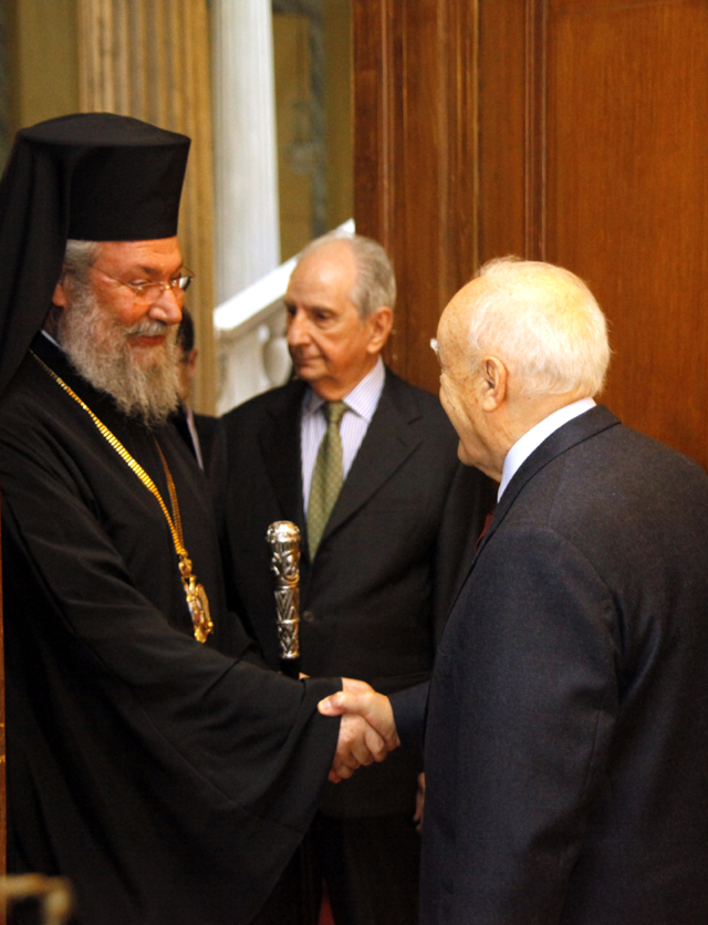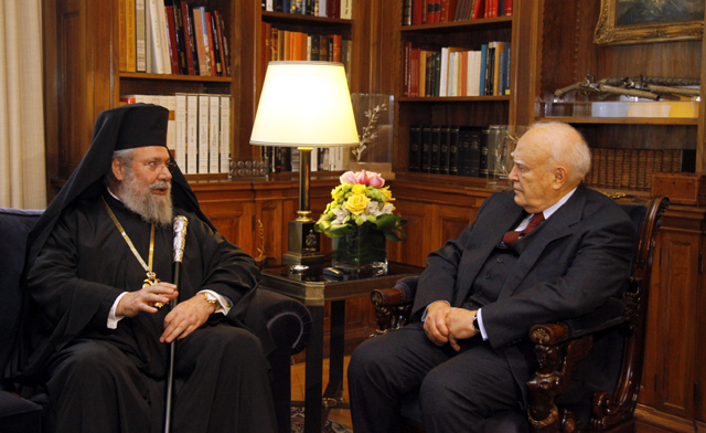 Συνεχίζοντας τον κύκλο επαφών του στην Αθήνα, με την πολιτική και πολιτειακή ηγεσία, ο επικεφαλής της Κυπριακής Εκκλησίας είχε μισή ώρα κατ΄ ιδίαν συζήτηση με τον κ. Παπούλια.
