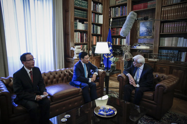 Η Ελλάδα θα επιδιώξει ακόμη μεγαλύτερη συνεργασία με το Βιετνάμ, με κοινό άξονα την εφαρμογή του διεθνούς δικαίου στο σύνολό του, υπογράμμισε ο Πρόεδρος της Δημοκρατίας Προκόπης Παυλόπουλος, κατά τη συνάντησή του με τον αναπληρωτή πρωθυπουργό και υπουργό Εξωτερικών της Σοσιαλιστικής Δημοκρατίας του Βιετνάμ Rham Binh Minh, στο Προεδρικό Μέγαρο.