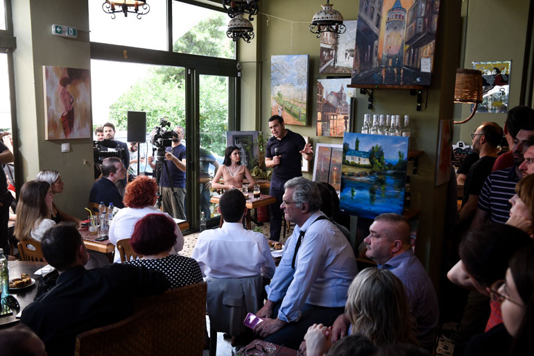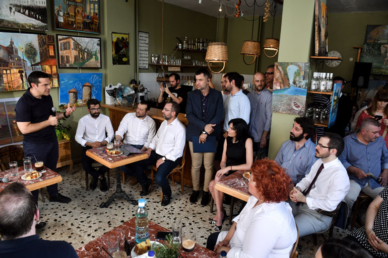 Το μεσημέρι του Σαββάτου ο πρωθυπουργός είχε συνάντηση με νέους επιστήμονες και εκπροσώπους startups στο εναλλακτικό καφενείο «Παντοκαφενές» στο Παλαιό Φάληρο, το οποίο δημιουργήθηκε ως Κοινωνική Συνεταιριστική Επιχείρηση Ένταξης.