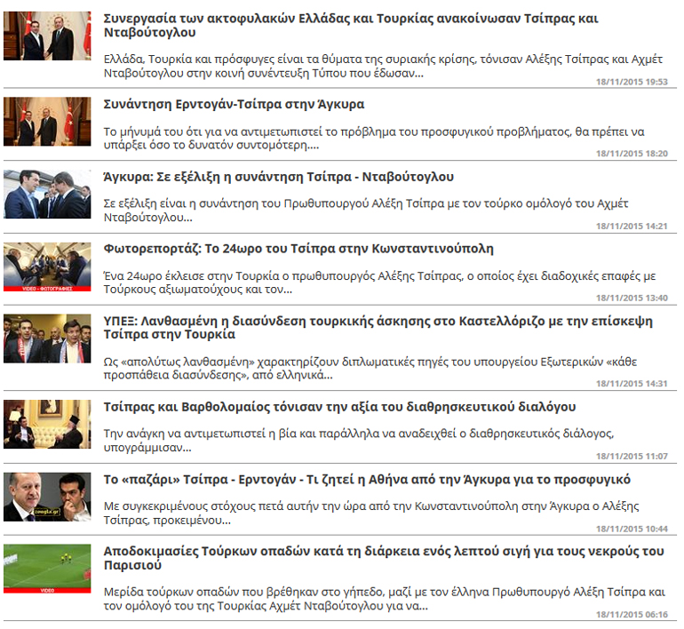 «Ούτε η Τουρκία ούτε η Ελλάδα έχουν καμία υπευθυνότητα έναντι του προσφυγικού προβλήματος. Αλέξης Τσίπρας και Αχμέτ Νταβούτογλου στην κοινή συνέντευξη Tύπου που έδωσαν στην Άγκυρα, ανακοίνωσαν τη λειτουργία μηχανισμού κοινής συνεργασίας των ακτοφυλακών των δύο χωρών για την αντιμετώπιση της παράνομης μετανάστευσης…Όμως την ευθύνη αυτή δυστυχώς αν και δεν την έχουμε, τη ζούμε καθημερινά στο Αιγαίο και η παγκόσμια κοινή γνώμη έχει εναποθέσει στους δικούς μας ώμους το βάρος. Είναι όμως ένα παγκόσμιο φαινόμενο και τα ανθρώπινα δικαιώματα πρέπει να απασχολούν το ίδιο και την Ευρώπη».