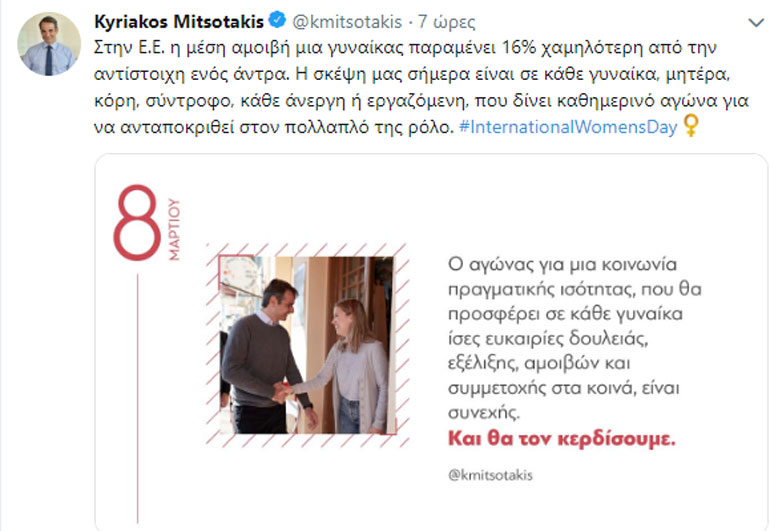 Η ανάρτηση συνοδεύεται από φωτογραφία του Κ. Μητσοτάκη με το εξής μήνυμα: «Ο αγώνας για μια κοινωνία πραγματικής ισότητας , που θα προσφέρει σε κάθε γυναίκα ίσες ευκαιρίες δουλειάς, εξέλιξης, αμοιβών και συμμετοχής στα κοινά είναι συνεχής. Και θα τον κερδίσουμε».