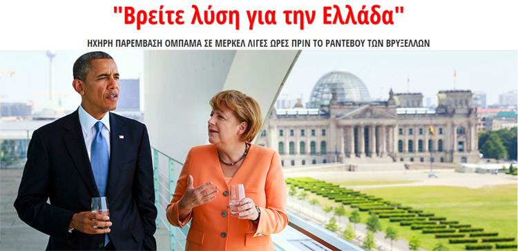 1. Το χθεσινό τηλεφώνημα του Μπάρακ Ομπάμα στην Άνγκελα Μέρκελ με το οποίο της ζήτησε να βρεθεί μια ρεαλιστική λύση για την Ελλάδα. Σύμφωνα με το Λευκό Οίκο, οι δύο ηγέτες «εξέτασαν τις πρόσφατες εξελίξεις στην Ελλάδα και τις προσπάθειες να επιτευχθεί μια ρεαλιστική συμφωνία που θα βασίζεται σε πρόσφατες μεταρρυθμίσεις για να επιστρέψει η χώρα στην ανάπτυξη εντός της ευρωζώνης». Το τηλεφώνημα Ομπάμα έχει ιδιαίτερη αξία, καθώς γίνεται λίγες ώρες πριν την Σύνοδο Κορυφής της ΕΕ και εκτιμάται δεόντως από κυβερνητικούς κύκλους.
