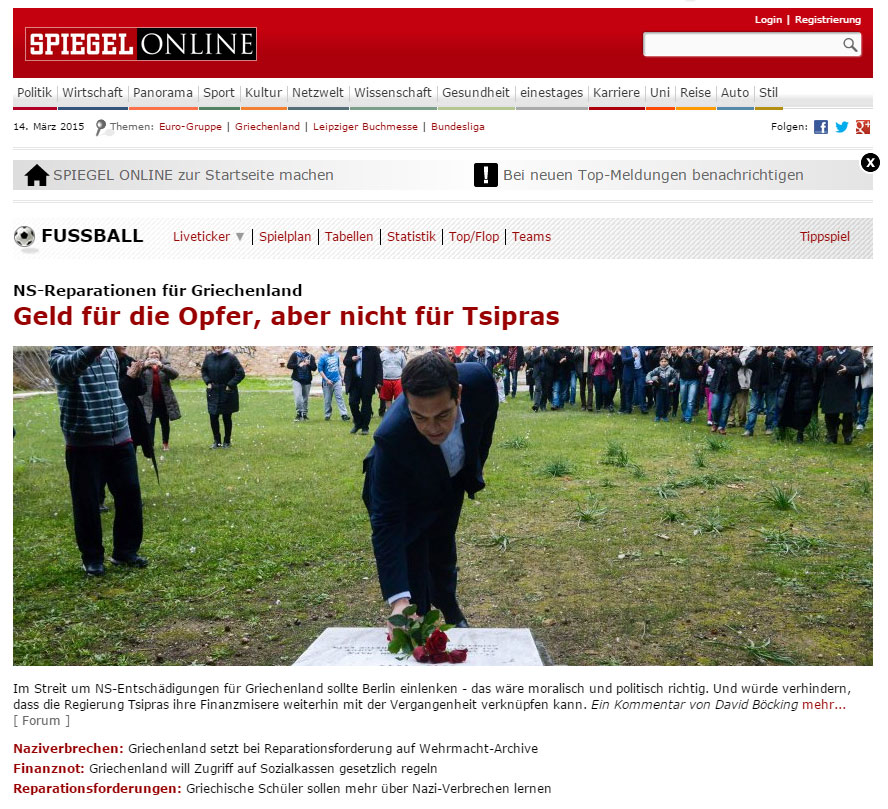 Το γερμανικό περιοδικό «Der Spiegel» με δημοσίευμά του τάσσεται υπέρ της καταβολής των γερμανικών αποζημιώσεων στην Ελλάδα, καθώς όπως τονίζει αυτό είναι αφενός ηθικά και πολιτικά σωστό, αφετέρου θα αφαιρέσει επιχειρήματα από τον πρωθυπουργό Αλέξη Τσίπρα. Ως αποζημιώσεις όμως εννοεί την καταβολή χρημάτων σε θύματα των σφαγών των Ναζί και σε καμία περίπτωση το σύνολο των οφειλών που διεκδικεί η Ελλάδα.