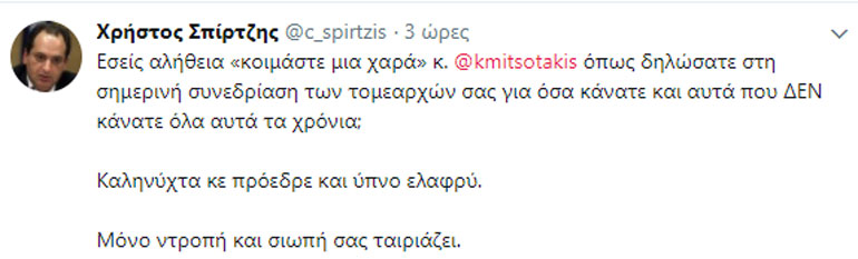 Έγραψε συγκεκριμένα ο κ Σπίρτζης: «Εσείς αλήθεια «κοιμάστε μια χαρά» κ. @kmitsotakis όπως δηλώσατε στη σημερινή συνεδρίαση των τομεαρχών σας για όσα κάνατε και αυτά που ΔΕΝ κάνατε όλα αυτά τα χρόνια; Καληνύχτα κε πρόεδρε και ύπνο ελαφρύ. Μόνο ντροπή και σιωπή σας ταιριάζει».