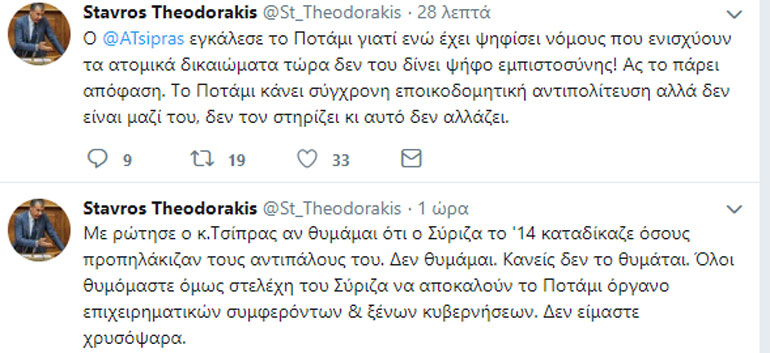 Σε άλλη ανάρτησή του, ο κ. Θεοδωράκης τόνισε πως «ο κ. Τσίπρας εγκάλεσε το Ποτάμι γιατί ενώ έχει ψηφίσει νόμους που ενισχύουν τα ατομικά δικαιώματα τώρα δεν του δίνει ψήφο εμπιστοσύνης! Ας το πάρει απόφαση. Το Ποτάμι κάνει σύγχρονη εποικοδομητική αντιπολίτευση αλλά δεν είναι μαζί του, δεν τον στηρίζει κι αυτό δεν αλλάζει».