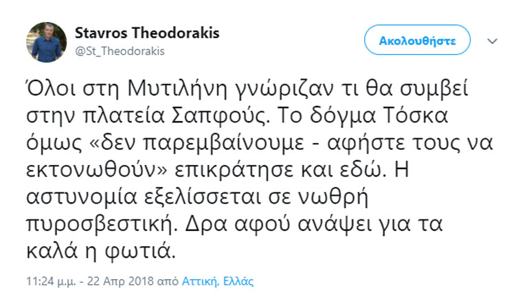 Ειδικότερα, αναφέρει: «Όλοι στη Μυτιλήνη γνώριζαν τι θα συμβεί στην πλατεία Σαπφούς. Το δόγμα Τόσκα όμως “δεν παρεμβαίνουμε – αφήστε τους να εκτονωθούν” επικράτησε και εδώ. H αστυνομία εξελίσσεται σε νωθρή πυροσβεστική. Δρα αφού ανάψει για τα καλά η φωτιά».