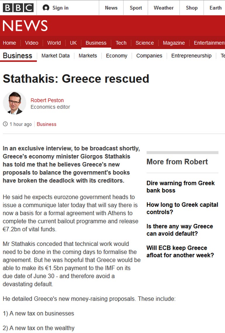 «Η Ελλάδα σώθηκε», δήλωσε στο BBC λίγη ώρα μετά το τέλος του Eurogroup, ο υπουργός Οικονομίας, Γιώργος Σταθάκης.