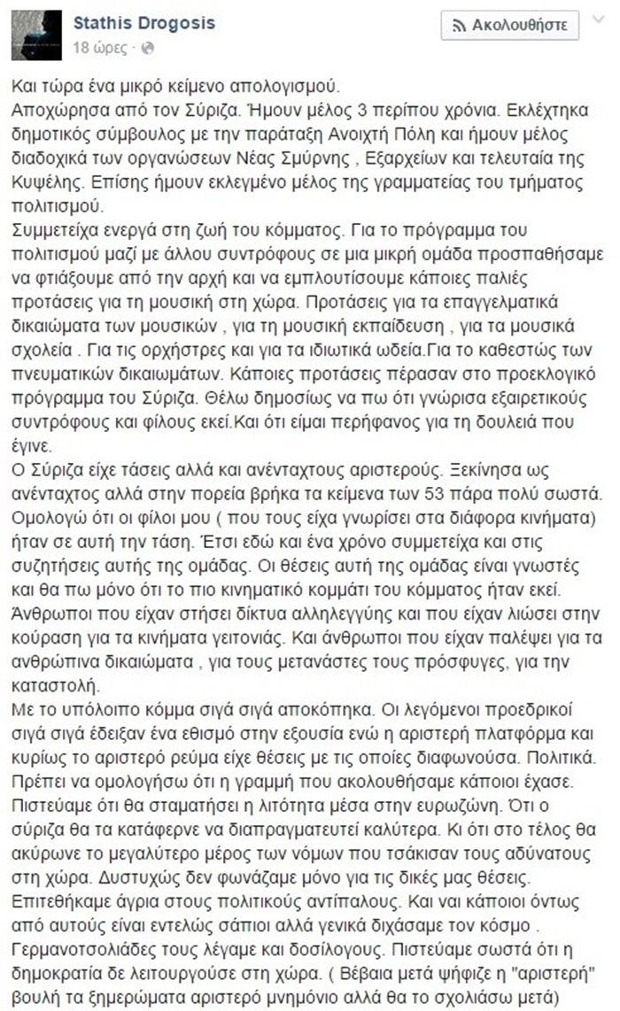Ο τραγουδιστής Στάθης Δρογώσης, που έχει εκλεγεί δημοτικός σύμβουλος στο δήμο Αθηναίων με την «Ανοιχτή Πόλη» του ΣΥΡΙΖΑ και ήταν εκλεγμένο μέλος της γραμματείας του τμήματος πολιτισμού, ανακοίνωσε μέσα από τον λογαριασμό του στο facebook ότι αποχωρεί από το κόμμα μετά από τρία χρόνια.