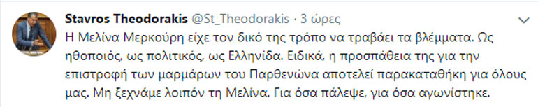 «Η Μελίνα Μερκούρη είχε τον δικό της τρόπο να τραβάει τα βλέμματα. Ως ηθοποιός, ως πολιτικός, ως Ελληνίδα. Ειδικά, η προσπάθεια της για την επιστροφή των μαρμάρων του Παρθενώνα αποτελεί παρακαταθήκη για όλους μας», αναφέρει σε ανάρτησή του στο Twitter ο Σταύρος Θεοδωράκης με αφορμή τη συμπλήρωση των 25 χρόνων από το θάνατο της Μελίνας Μερκούρη. «Μην ξεχνάμε λοιπόν τη Μελίνα. Για όσα πάλεψε, για όσα αγωνίστηκε», σημείωσε.