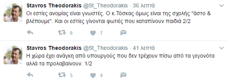 Συγκεκριμένα ο Σταύρος Θεοδωράκης ανέφερε: «Η χώρα έχει ανάγκη από υπουργούς που δεν τρέχουν πίσω από τα γεγονότα αλλά τα προλαβαίνουν» ενώ σε δεύτερη ανάρτησή του τόνισε:
