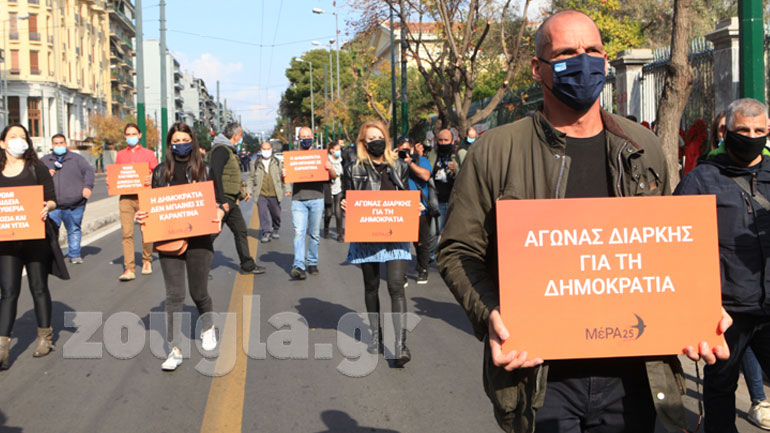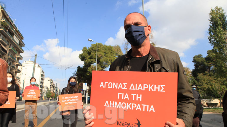 Στεφάνι κατέθεσαν μέλη του Μέρα25 ενόψει της επετείου του Πολυτεχνείου. Ανάμεσά τους ήταν και ο πρόεδρος του Μέρα25, Γιάνης Βαρουφάκης, τηρώντας τα μέτρα προστασίας κατά της εξάπλωσης του κορωνοϊού και κρατώντας πλακάτ που έγραφαν, μεταξύ άλλων: «Η δημοκρατία δεν μπαίνει σε καραντίνα» και «Αγώνας διαρκής για τη δημοκρατία». Παράλληλα, πραγματοποίησε πορεία με άλλα έξι μέλη από το Πολυτεχνείο προς την Αμερικανική Πρεσβεία.