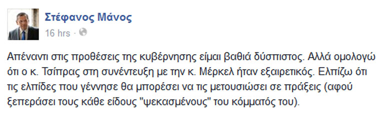 Ο κ. Μάνος μέσω του προσωπικού του λογαριασμού στο Facebook εξέφρασε, την ελπίδα ότι ο πρωθυπουργός θα μετουσιώσει σε πράξεις τις ελπίδες που γέννησε με την προϋπόθεση, όπως σημειώνει, «να ξεπεράσει τους κάθε είδους “ψεκασμένους” του κόμματός του».