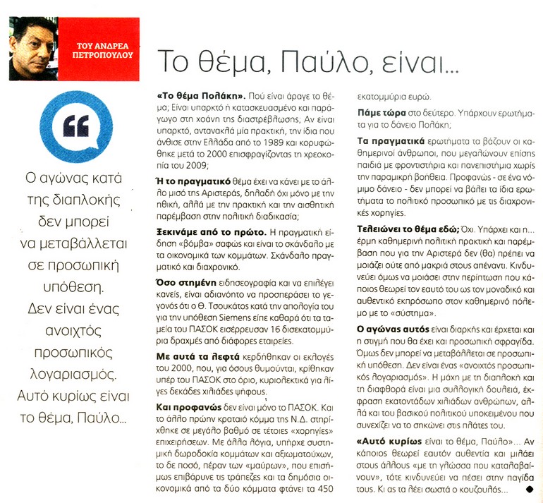 Όμως, το πρωί της Παρασκευής δημοσιεύθηκε από την εφημερίδα «Αυγή» σχόλιο με τίτλο «Το θέμα, Παύλο, είναι…».
