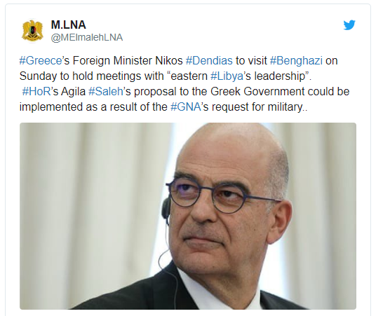 Ειδικότερα, ο υπουργός Εξωτερικών ταξίδεψε με το κυβερνητικό αεροσκάφος για την έδρα του Εθνικού Στρατού της Λιβύης (LNA), τη Βεγγάζη όπου, σύμφωνα με διπλωματικές πηγές, συναντήθηκε με τον στρατάρχη Χαλίφα Χαφτάρ.